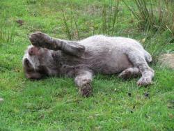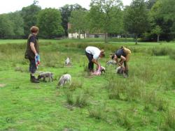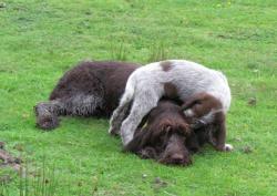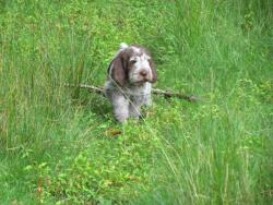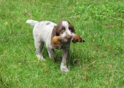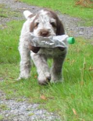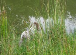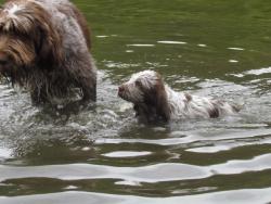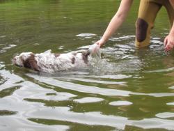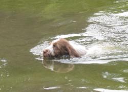 Im Alter von 7 Wochen bei einem Ausflug ins Revier — es scheint zwar keine Sonne, aber es ist warm genug für die ersten kleinen Schwimmübungen