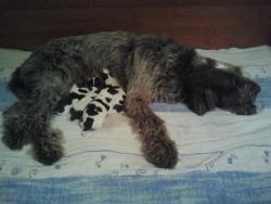 Pebbles mit ihren 4 Welpen (3 Rüden und 1 Hündin) am Tag der Geburt: "Muffin", "Mortimer", "Mason" und "Merle"