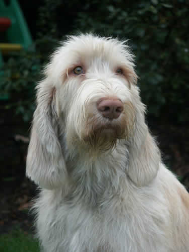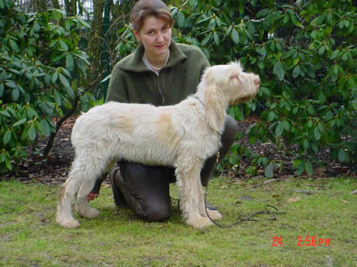 Im Haus ist Alfine inzwischen aus dem etwas temperamentvollerem Welpen/Junghundalter heraus und hat sich zu einem typischem ruhigen und gelassenen Spinone entwickelt. Im Garten ist sie nach wie vor der beste und freudigste Spielkamerad unserer Kinder. Anderen Hunden gegenüber ist sie von sich aus stets aufgeschlossen, freundlich und interessiert. Fremden Personen gegenüber ist sie Anfangs eher misstrauisch, wenn sie sie dann aber für gut eingeschätzt hat, holt sie sich auch gerne dort noch ein paar extra Streicheleinheiten.