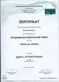 Wir haben das Zertifikat über das Bestehen des Grundmoduls I der Ausbildung zum Anoplophora-Spürhunde-Team am Institut für Waldschutz des BFW in Ossiach, Österreich erhalten.