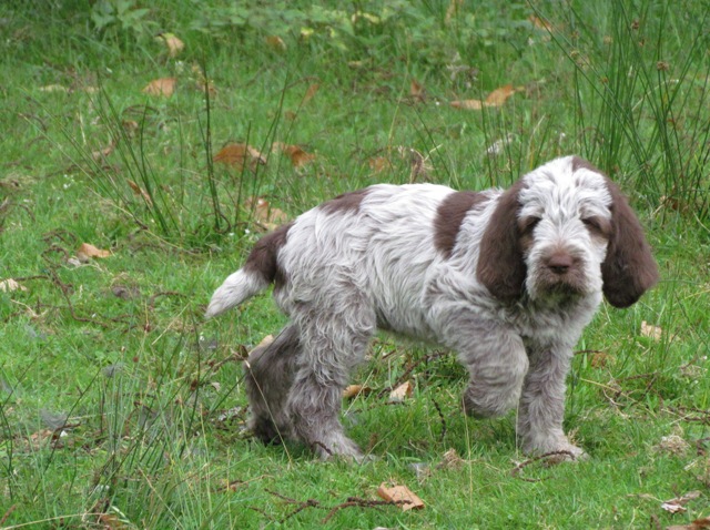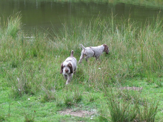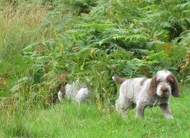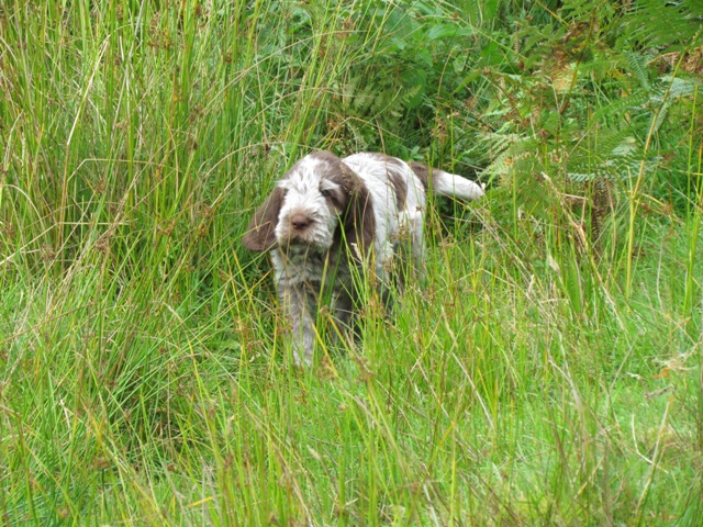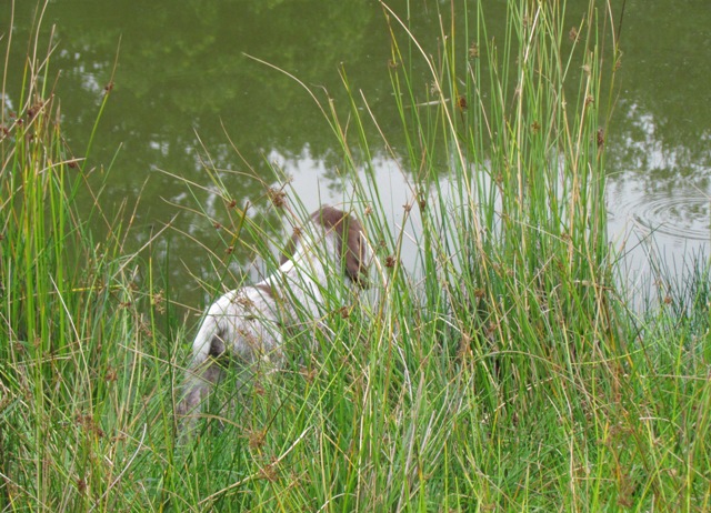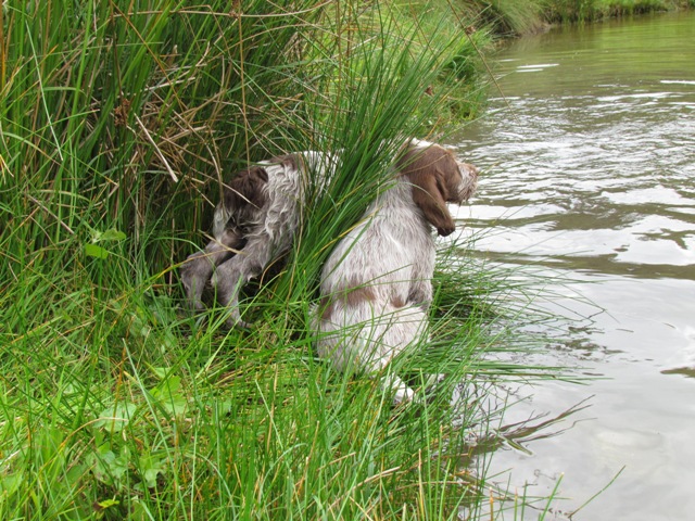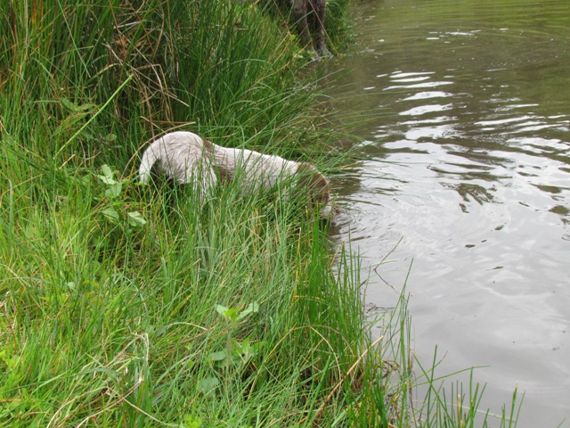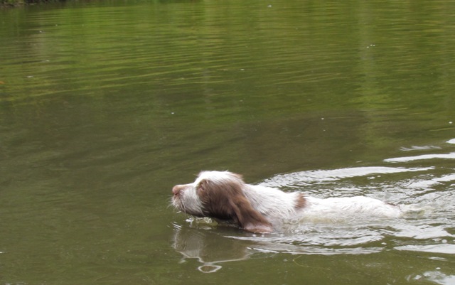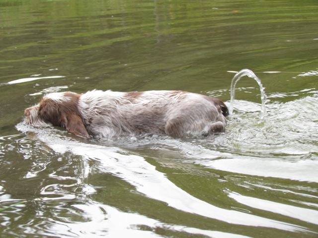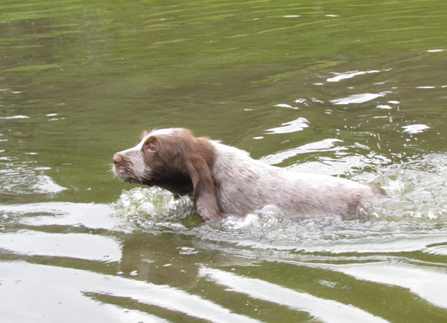 Im Alter von 7 Wochen bei einem Ausflug ins Revier — es scheint zwar keine Sonne, aber es ist warm genug für die ersten kleinen Schwimmübungen