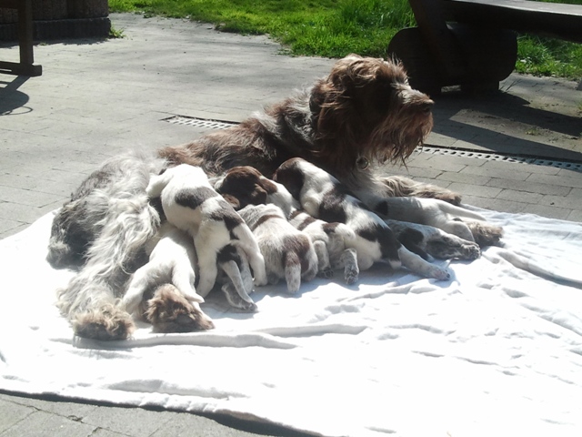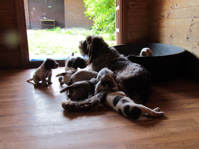 Peaches mit ihren 8 Welpen (6 Rüden/2 Hündinnen) am Tag nach der Geburt: