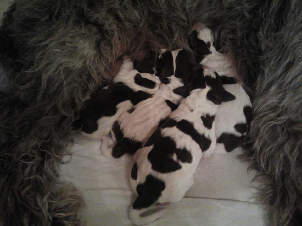 Pebbles mit ihren 4 Welpen (3 Rüden und 1 Hündin) am Tag der Geburt: "Muffin", "Mortimer", "Mason" und "Merle"